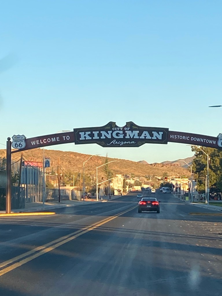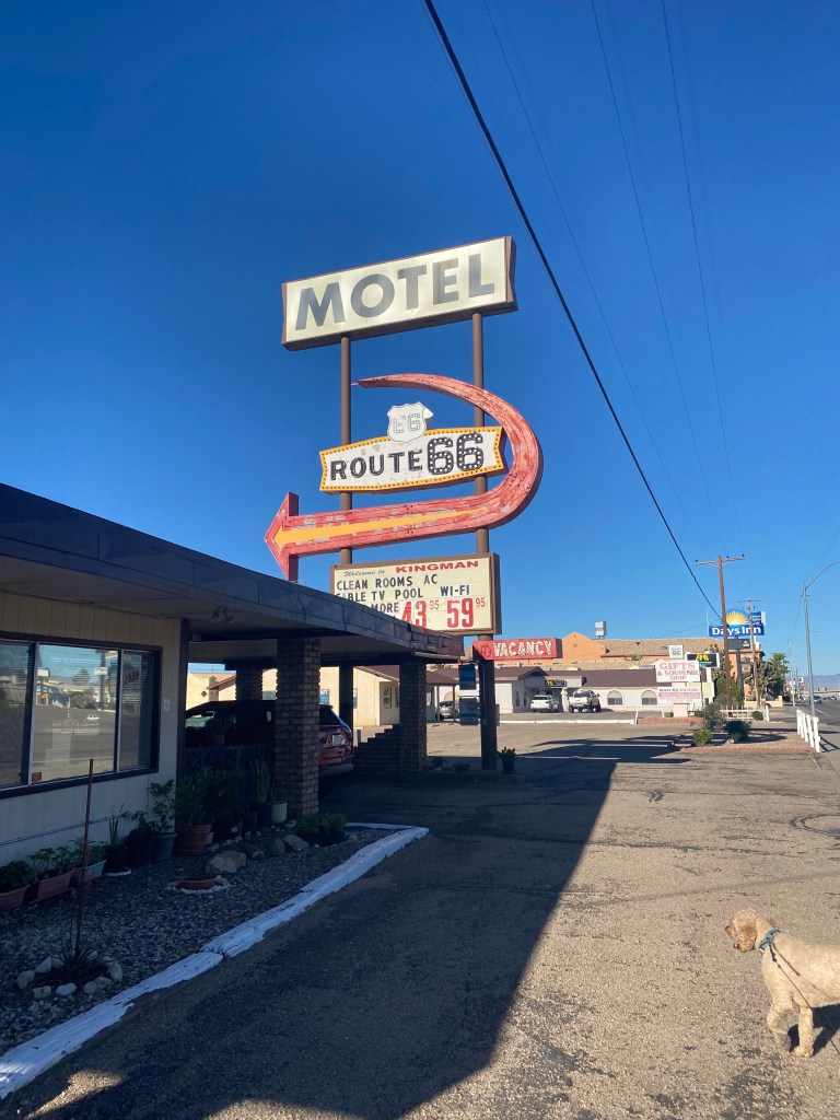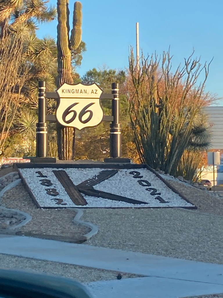 Anyway, here we are in Kingman, Arizona for our last night of our most incredible adventure. We got in early and it was a beautiful 81 degrees (after starting our day at near freezing) so Dug and I walked down Hwy 66 to a park. The dogs in the dog park were too scary for me (therefore for Dug) so we walked down a side street back to the hotel. Glen and I then ventured into town for dinner at a place that he found on Yelp. Sadly, when we got there it was permanently closed. COVID? Lack of tourist business? Kingman is a quintessential small town that is dying for lack of industry and the newer highway now skirts around the downtown. The town is really trying to make it a place to stop and the downtown looked like it would be fun for poking around. But sadly, times seem to be passing it by…