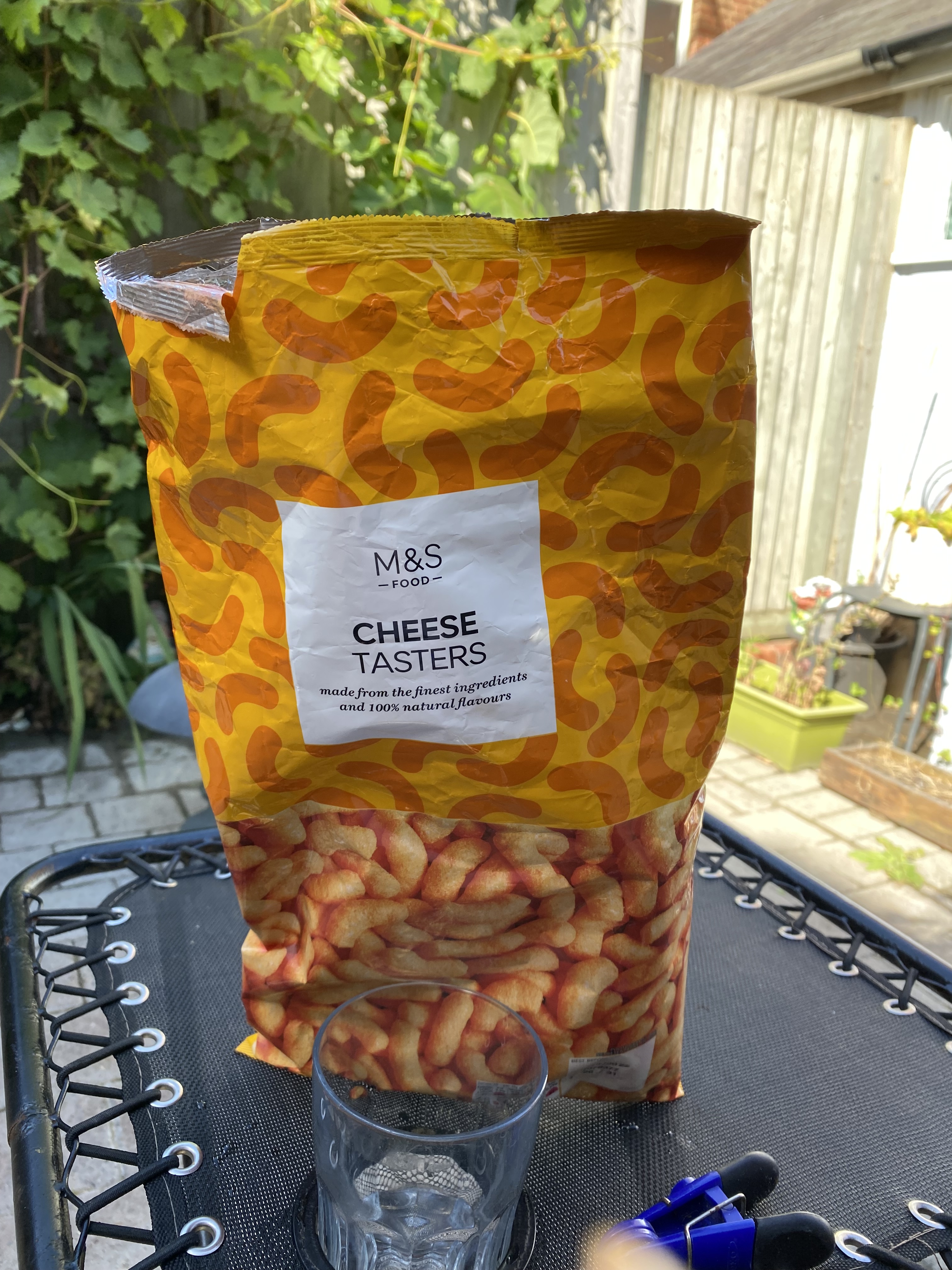 Snacks! I use to dive into a bag of what we Americans generally call potato chips with uncontrolled reckless abandon. My early preference was pork rinds and Hires root beer. And if I wasn’t careful I’d eat the whole bag and two root beers in 15 minutes. The specific bag included in this photo is the same as the one in the photo taken by Joyce. It is also likely in a photo of our trip South and quite possibly even West. If you do the math on the calories (English labeling ain’t American labeling) the calories you get 1,302.5. These work for me now as they dissolve in my mouth and are easy for me to swallow. And it seems there’s an endless supply at the bottom of this darn bag.