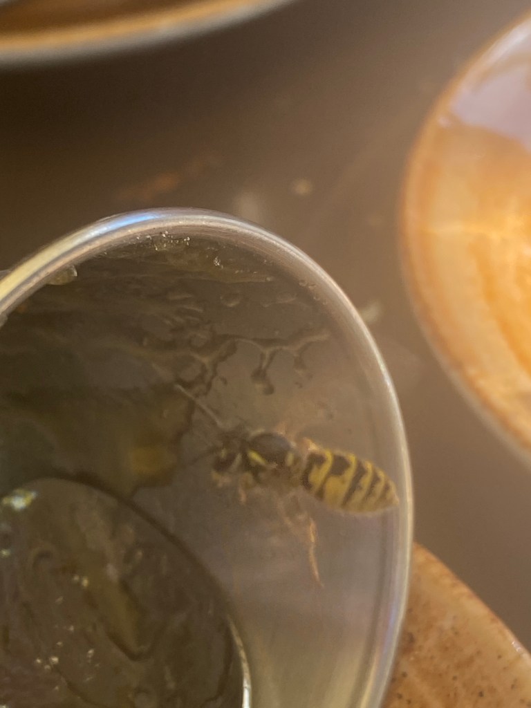 They dive bomb us for our jam and just sit in the jam cup or on our already jammed bread. Pay attention as you eat or you might get a mouthful of bee! Oh and they also dive INTO the tiny spout of the sugar container. They dive down to the bottom and eventually return…they must be drunk on sugar by then!